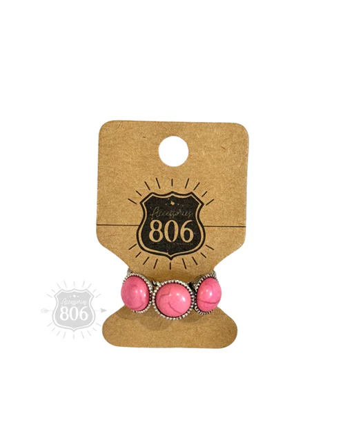 This silver tone ring has three round stones in the center. Open in back and is adjustable. One size fits most.