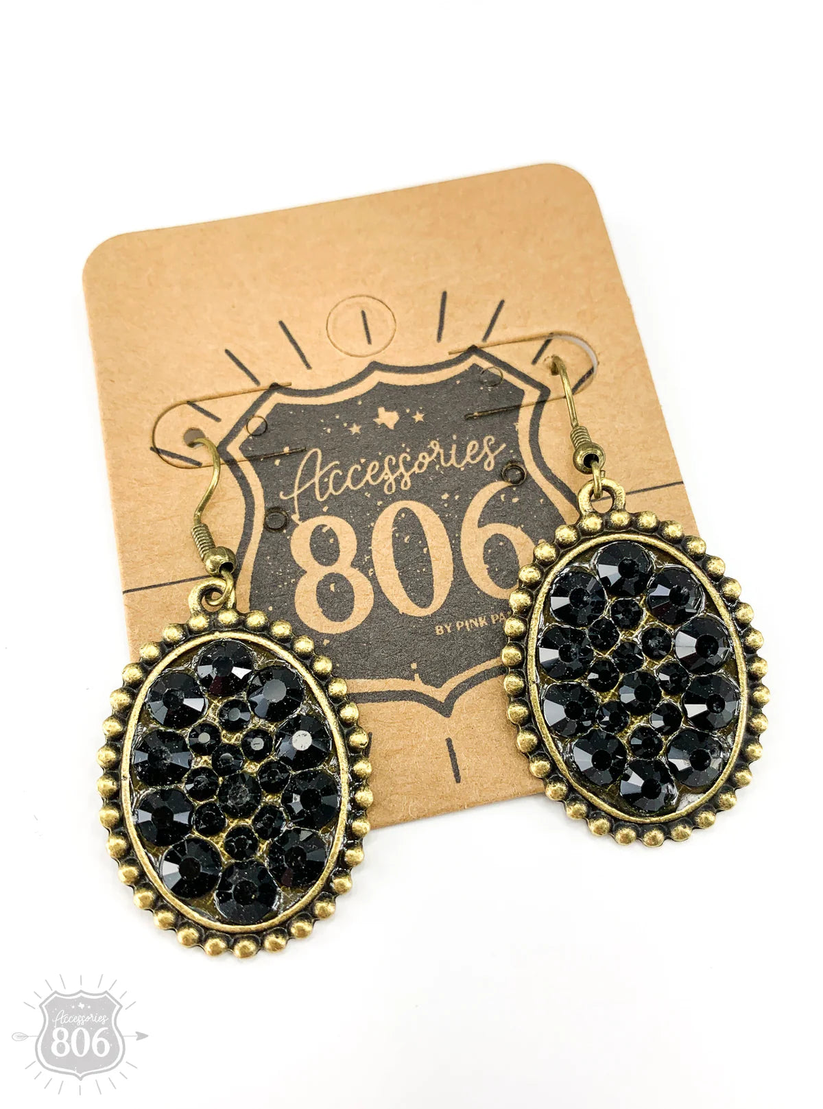 Small oval earring filled with rhinestones on fish hook. Approximately 1.5 inches in length.