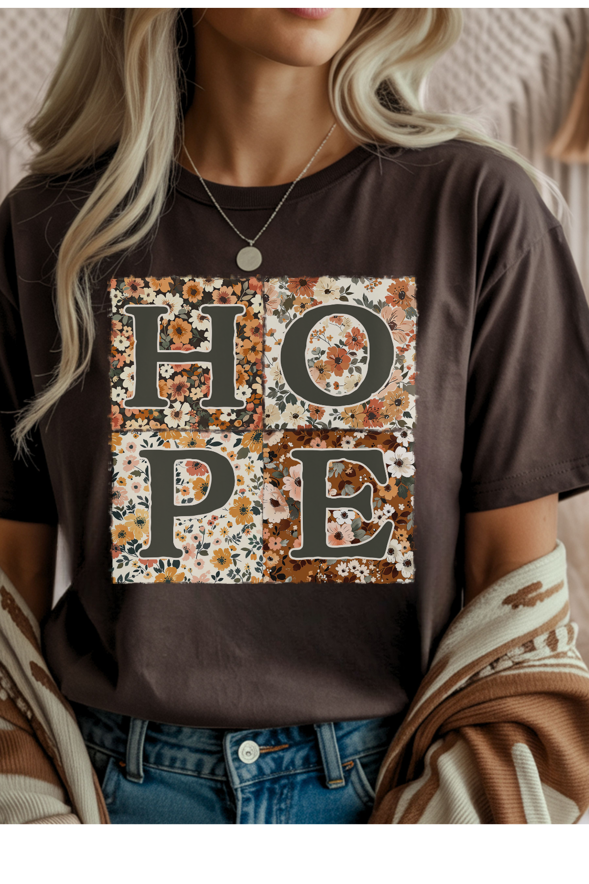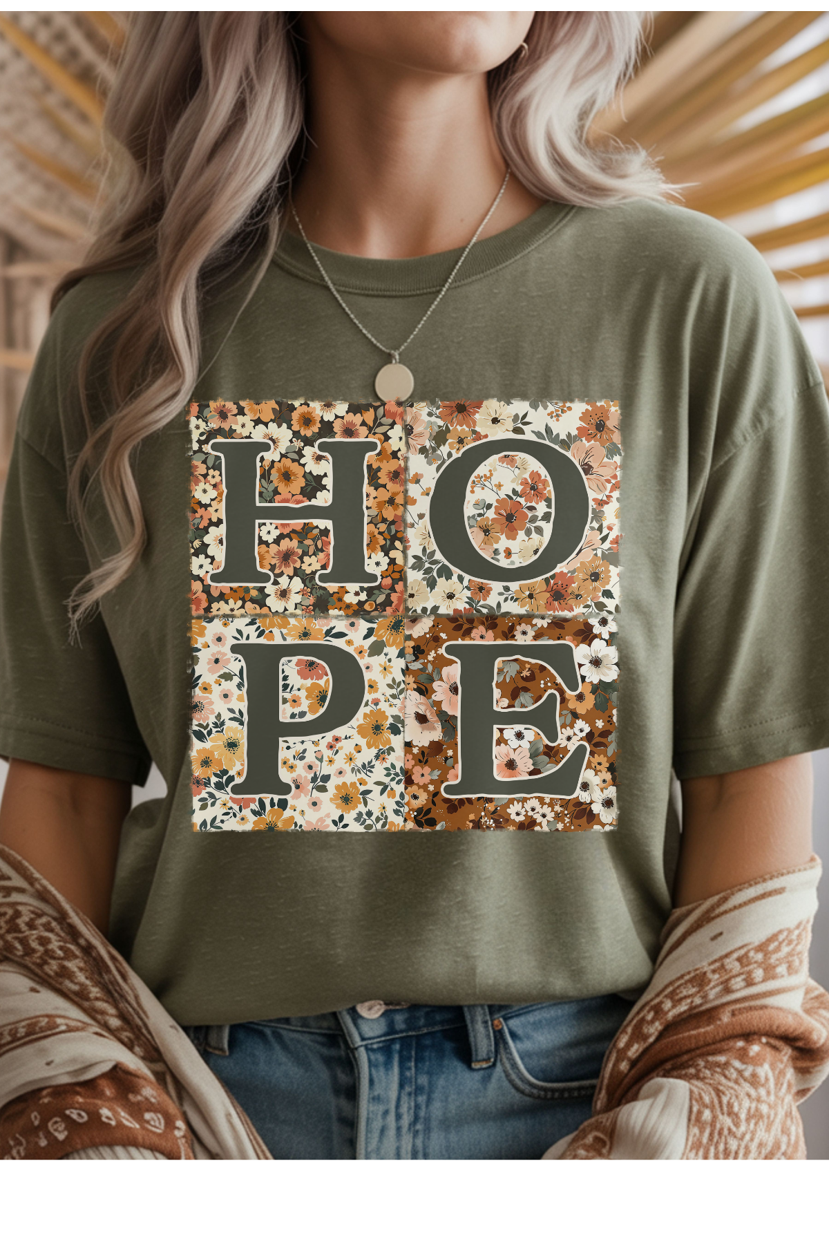 Embrace autumn vibes with the Hope T-Shirt, featuring a playful fall floral graphic that brightens your look. Crafted from super soft fabric, it brings cozy comfort while adding a cheerful touch to your seasonal wardrobe. Perfect for layering or wearing solo, this tee makes every day feel fresh and hopeful.